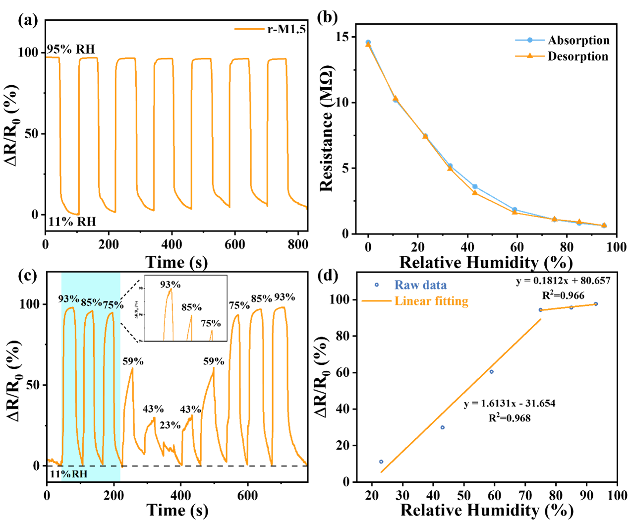 图2 rGO/MoS2纳米复合敏感薄膜(摩尔比1:1.5)湿度传感器具备良好的稳定性、可重复性、阶梯湿度响应与线性度