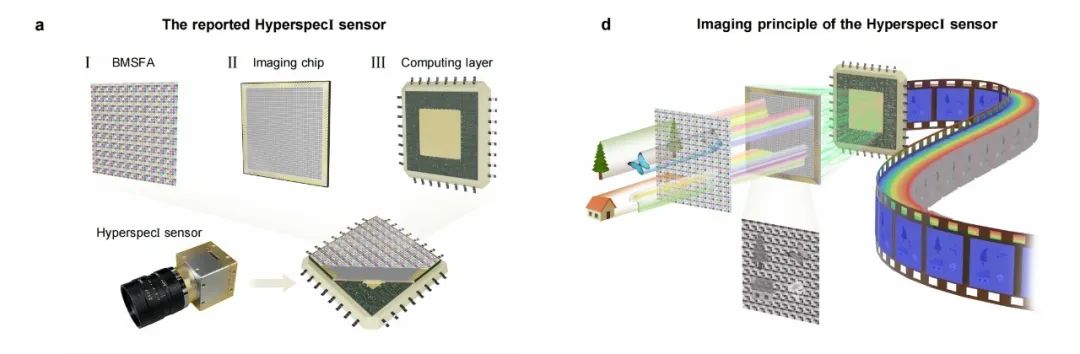 文章题为“A broadband hyperspectral image sensor with high spatio-temporal resolution”。团队提出了片上光谱复用感知理论与技术,颠覆了传统几何分光、窄带测量、物理输出模式,实现了片上宽带异化调控的高光谱成像。团队自主研制了高光谱智能成像器件,将光能利用率由典型的不足25%跨越提升至74.8%。该器件仅重数十克,工作波段覆盖了可见光和近红外超宽波段(400-1700nm),具有国际领先的空-时-谱分辨率(1024×1024@124fps,96通道),拥有完全自主知识产权。